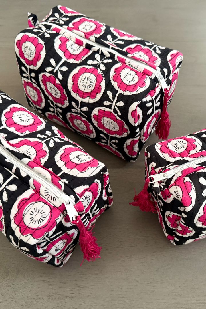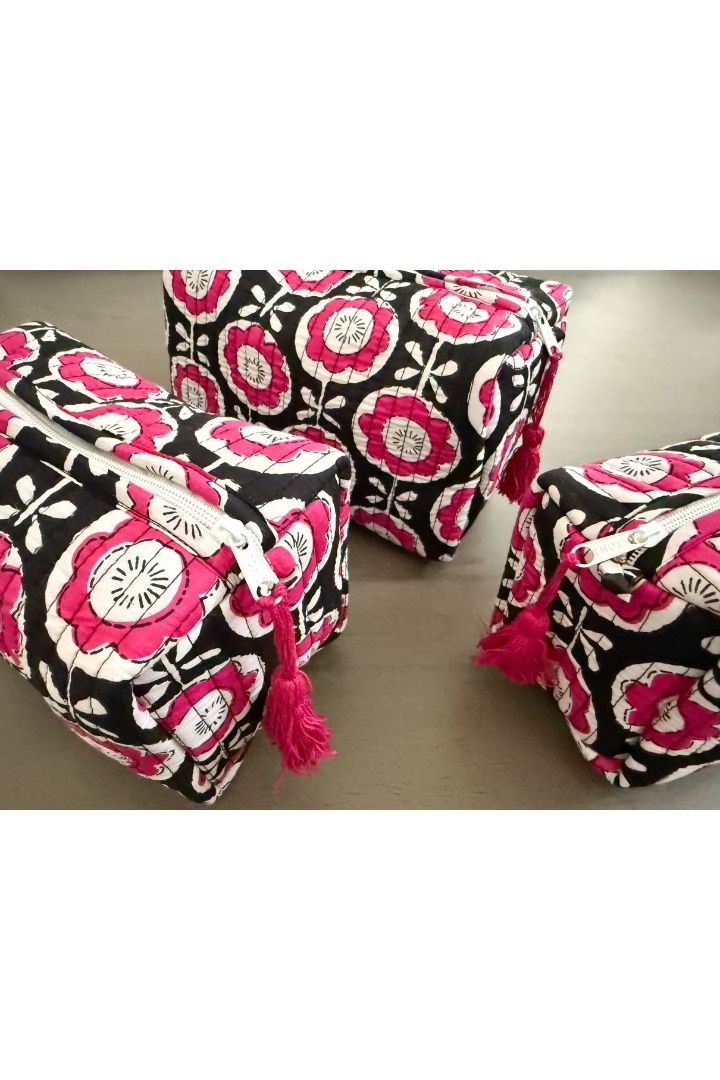 Set of 3 Flower Print Quilted Cotton Cosmetic,Travel, Toiletry Bags - Black and Pink