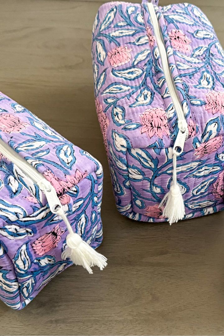 Set of 3 Printed Quilted Cosmetic/Travel Bags in Lavender floral print.