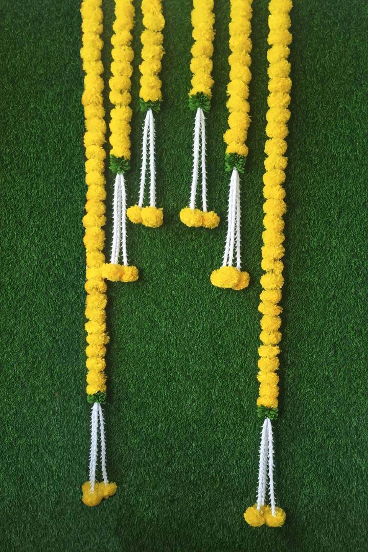 Each garland is made with yellow marigold flowers with lily flower bunch in the bottom. The bunch has 3 white lily/tuberose strings at the bottom.