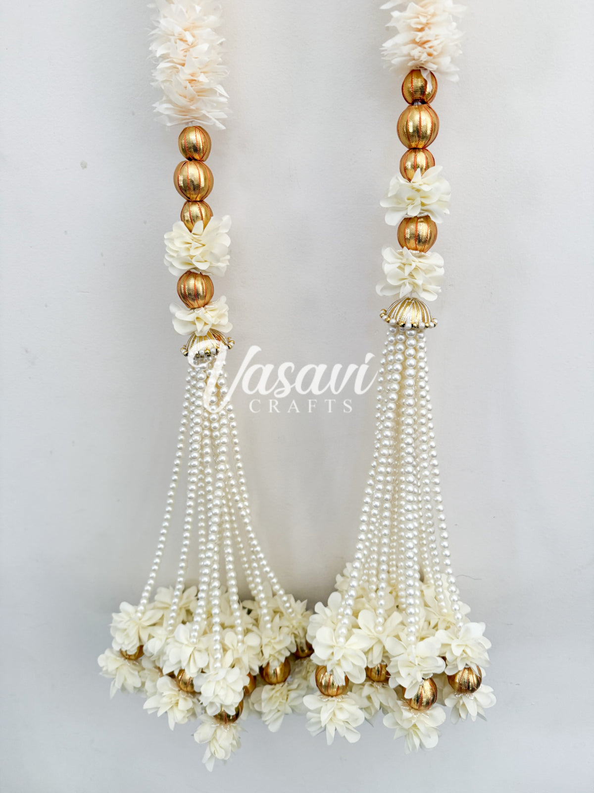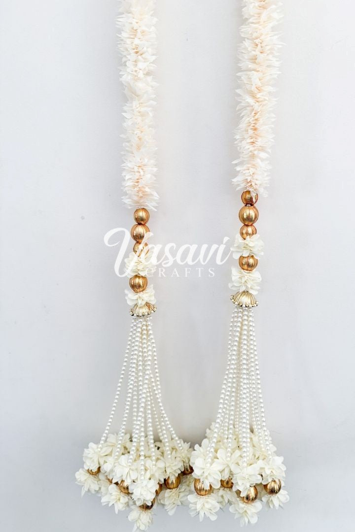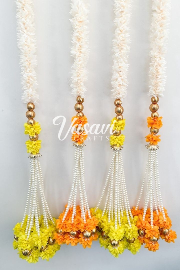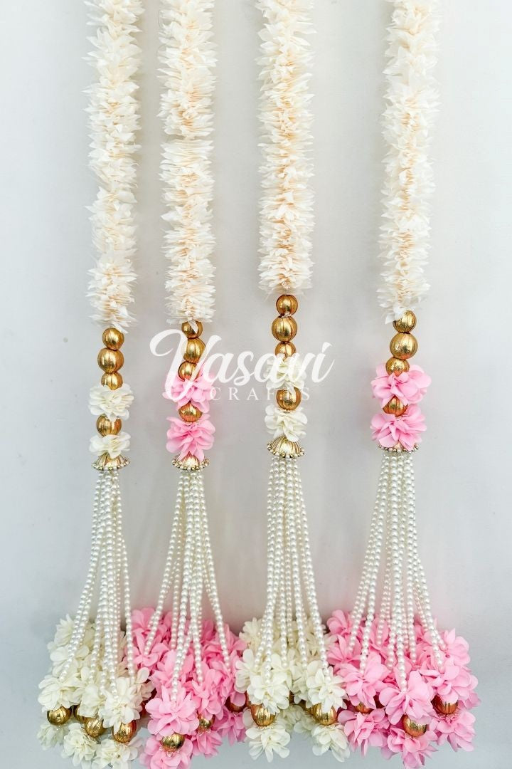 Each garland has a bunch at the bottom made with pearls, flowers and gota balls.